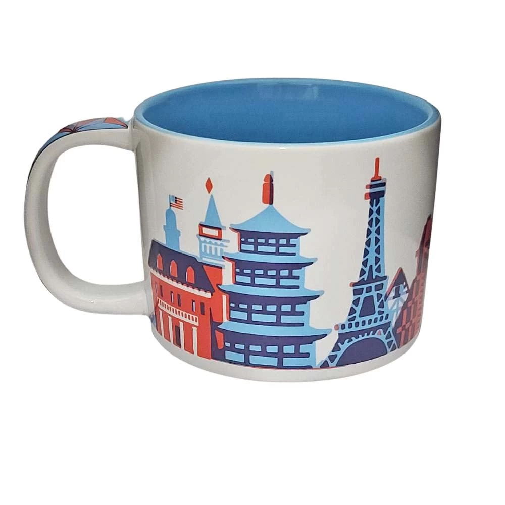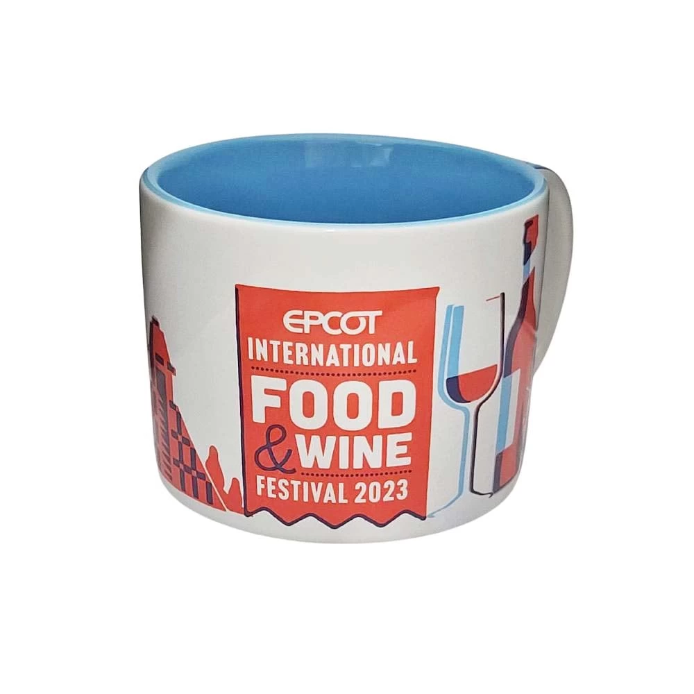 Start your day with a burst of festival excitement with our Epcot Food and Wine Festival Mug! This delightful mug features a vibrant banner showcasing the festival logo, accompanied by captivating images of wine glasses, bottles, mouthwatering food items, and iconic World Showcase buildings in contrasting shades of red and blue.