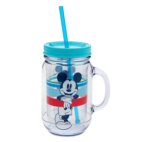 Inspired by classic storage jars, this drinking bottle features double-walled design with handle, twist top lid, and straw. Part of the bold and colorful ”Summer Fun” collection, its novel artwork shows Mickey’s front and back.