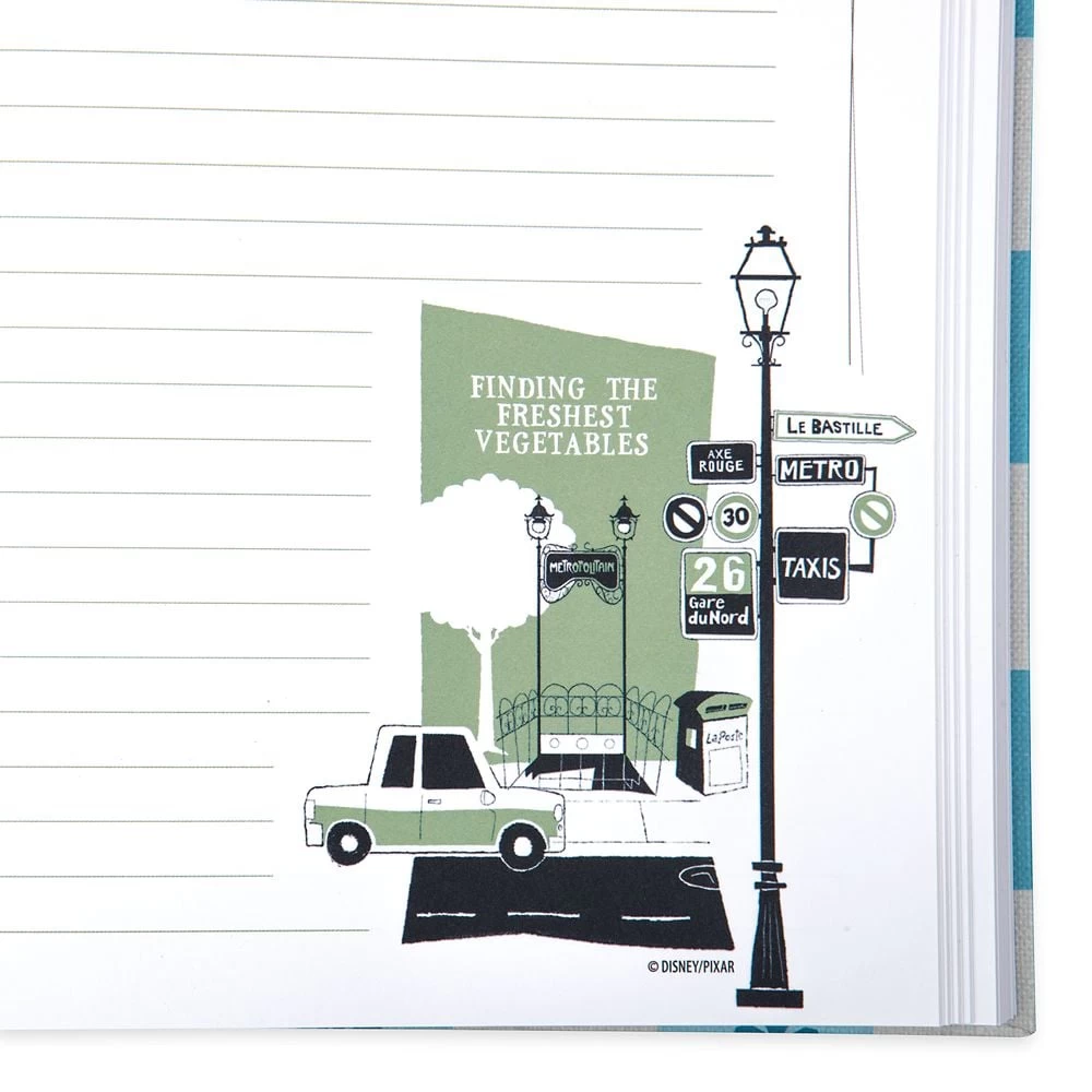 If Remy had a real-life journal, this is just what it would look like. Hardbound cookbook styling–as seen in Ratatouille–features chef Auguste Gusteau on front, with ruled pages and tasteful illustrations, plus ”rattail” bookmark.