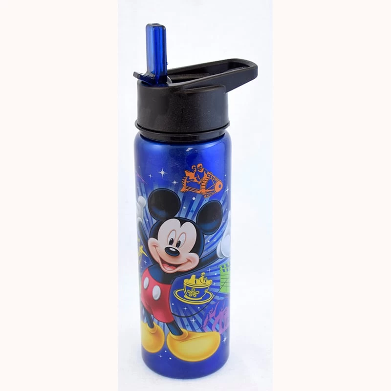 This brushed stainless steel water bottle with twist-on cap and pop up drinking straw/sippy straw features Mickey Mouse and Disney park icons!