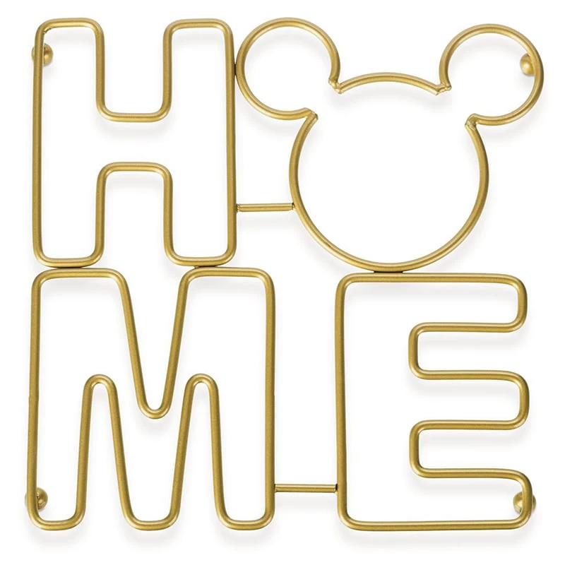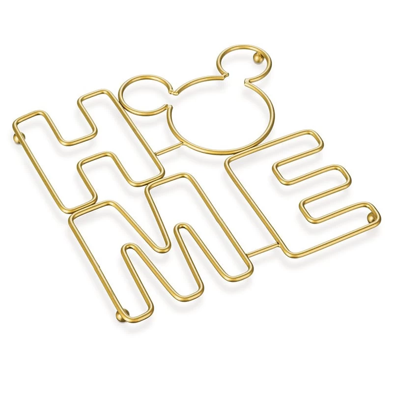 Enjoy some delicious ”Home” cooking when using this Mickey Mouse trivet. His iconic silhouette forms the letter ”o” in the goldtone wire that outlines the word ”HOME” of this kitchen accessory that puts the fun in functional.
