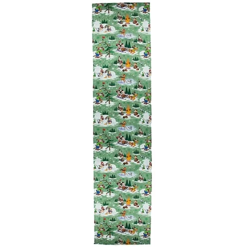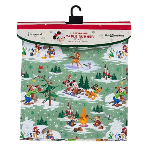 Dress your dining table up for the holidays with this reversible runner. Both sides feature allover snow-covered wintry scenes of this Happy Holidays print featuring Santa Mickey Mouse and Friends.