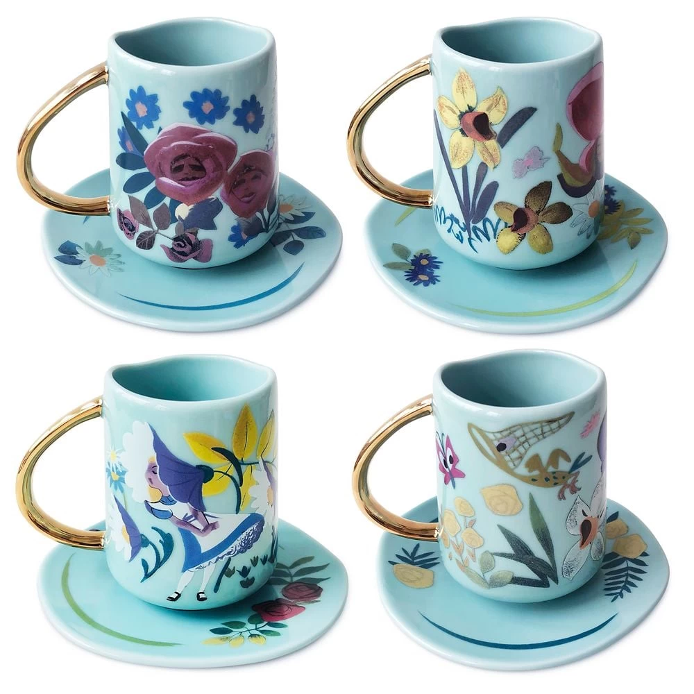 Every day is a Golden Afternoon when sipping a spot of tea from this set of four porcelain teacups with matched saucers featuring Alice and the Garden of Live Flowers. Designs adapted from inspirational art for Alice in Wonderland by Disney Legend Mary Blair.