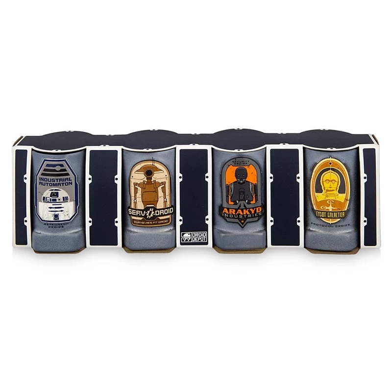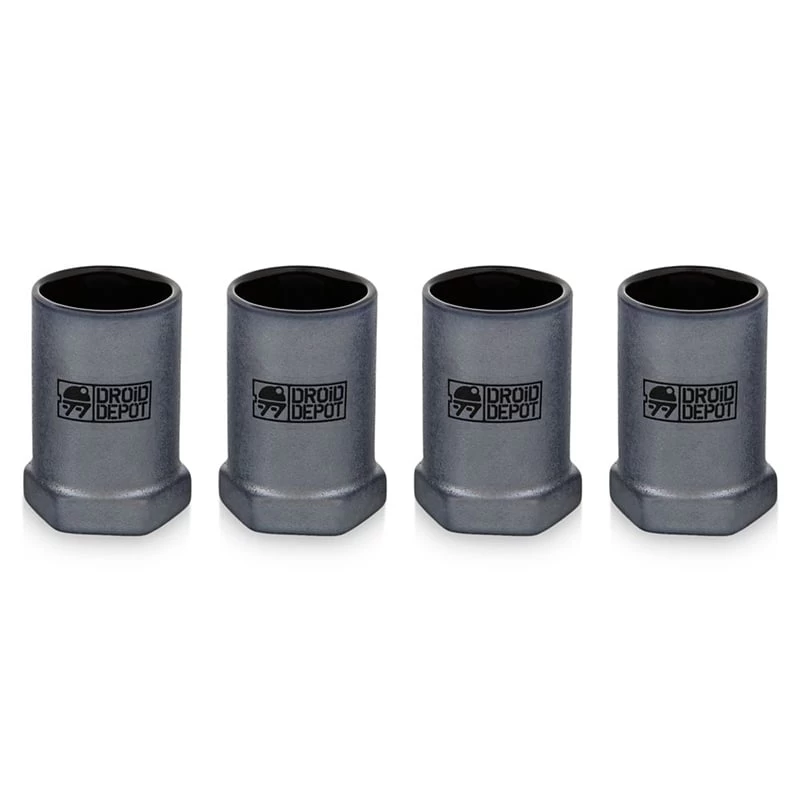 This set includes four ceramic Droid Depot souvenirs that are cylindrical with a hexagonal base, giving the appearance of an industrial bolt. Each of the small containers features screen art and text referencing a different kind of droid and its function.