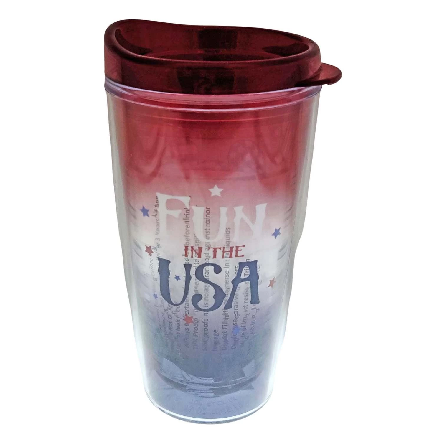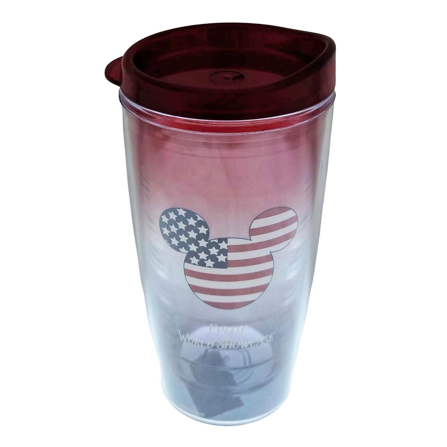 Mickey has fun in the USA when he visits the USA pavilion at Epcot World Showcase. This double wall tumbler features ”Fun in the USA” text graphic on one side and the Epcot World Showcase USA flag Mickey icon graphic on the other.